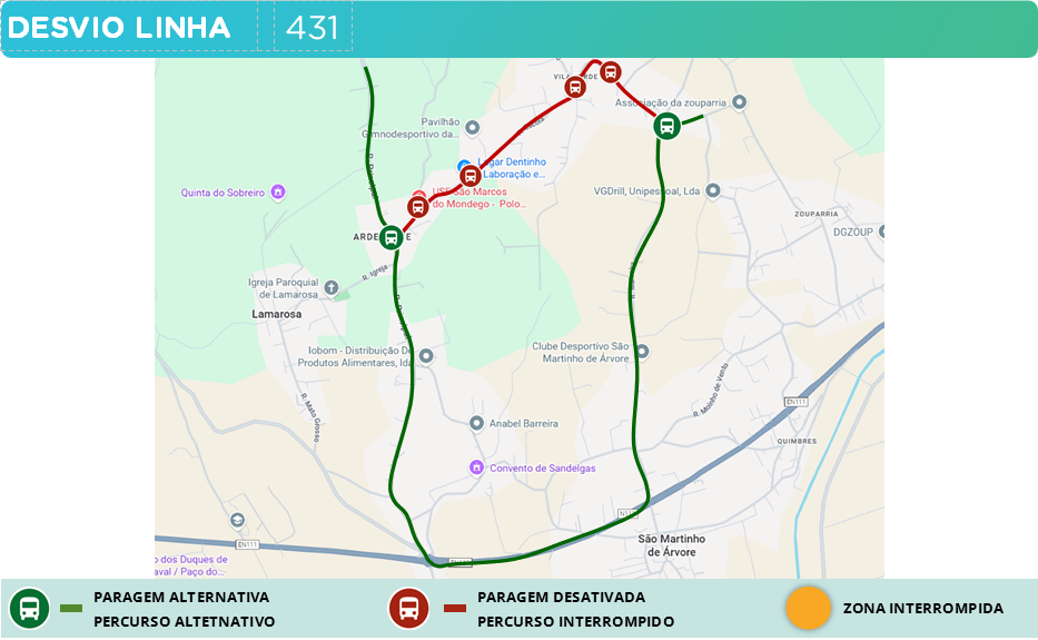 A partir do dia 12 de janeiro (segunda-feira), logo que a sinalização indique, devido a obras em Vila Verde (Coimbra), a linha 431 (ambos os sentidos) tem o seu percurso afetado na Rua da Escola e Rua Fonte de São Pedro.